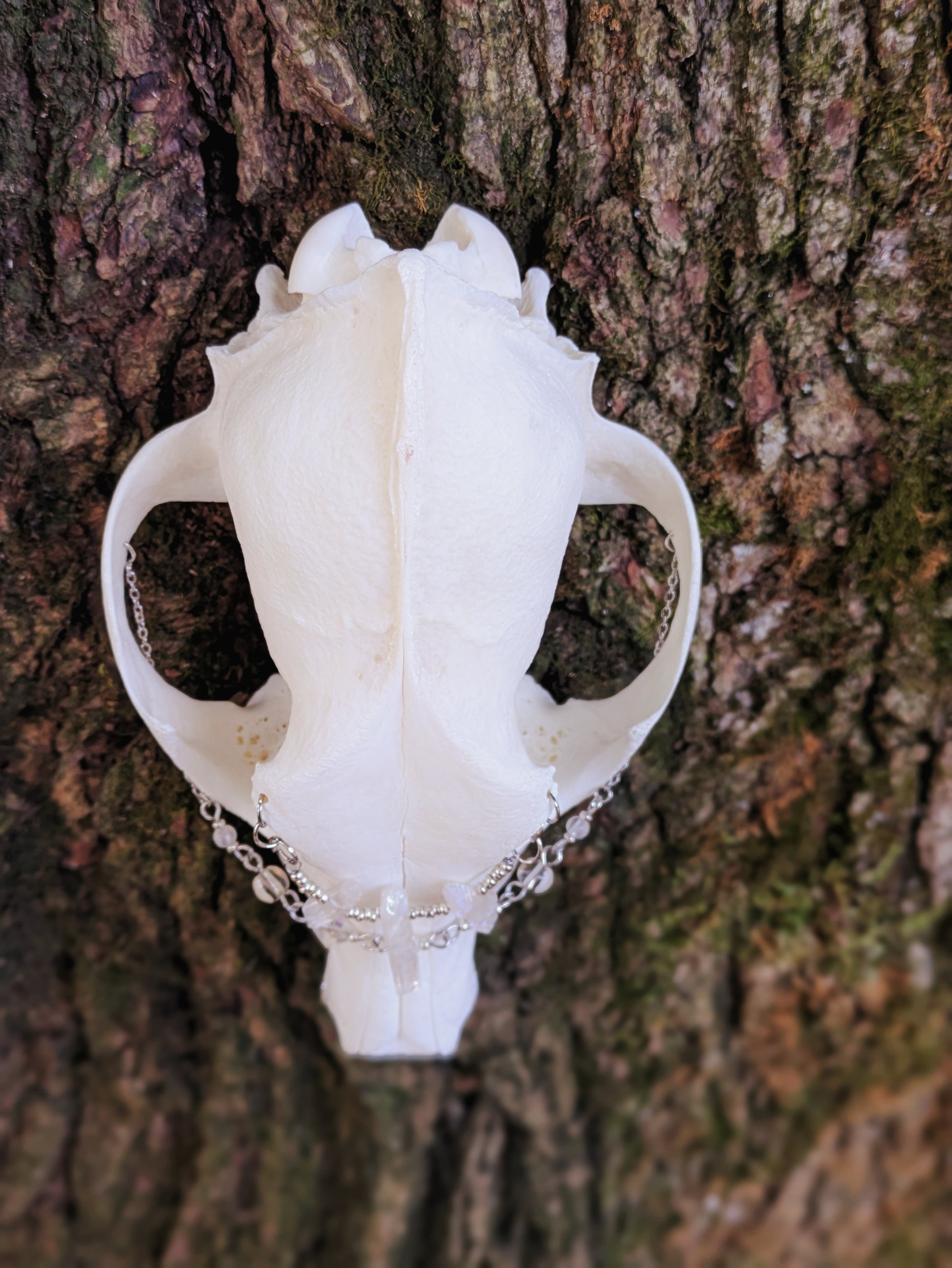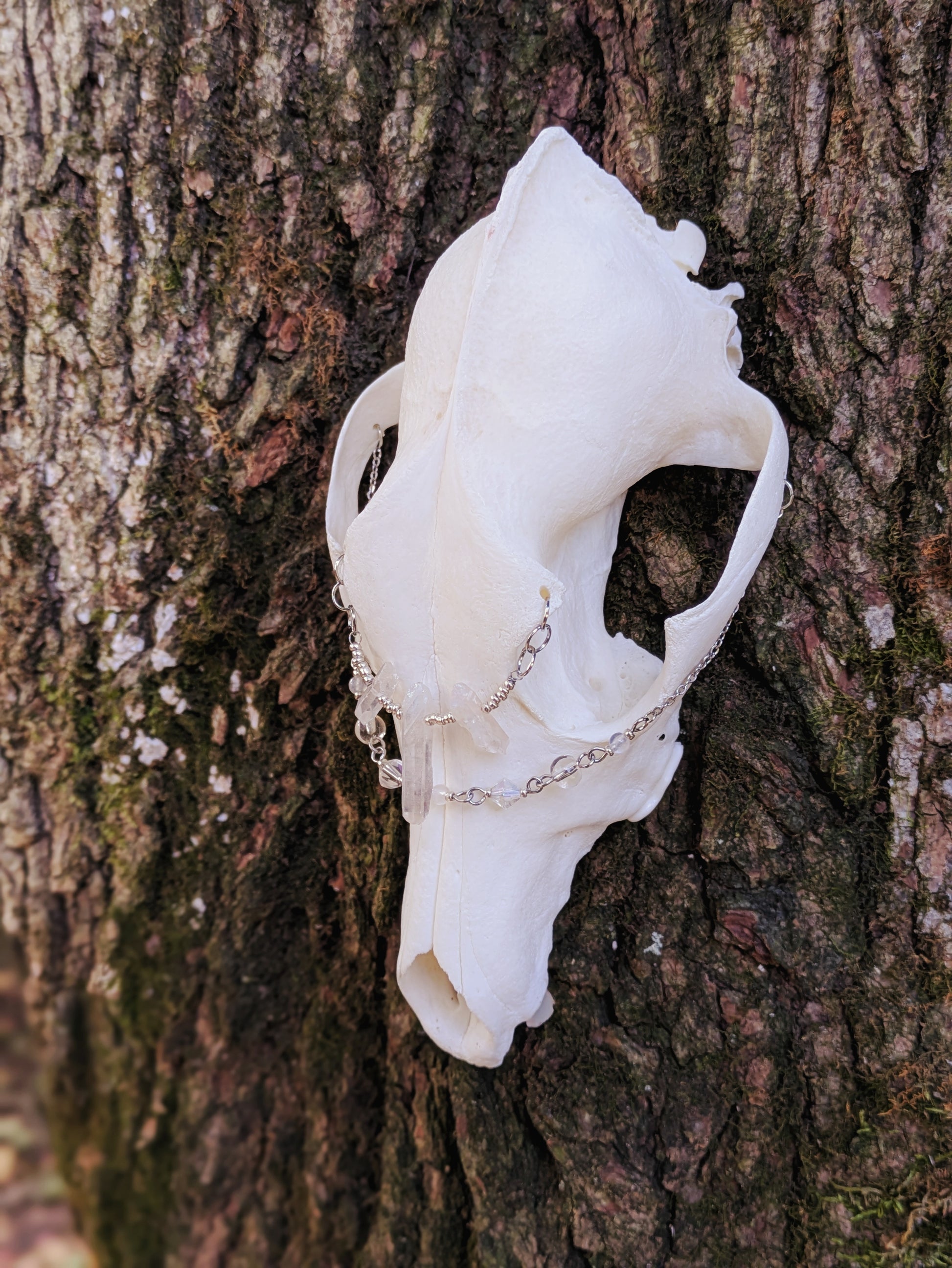 Coyote skull with vintage beads, aura quartz point crystals, and two moonstone gems